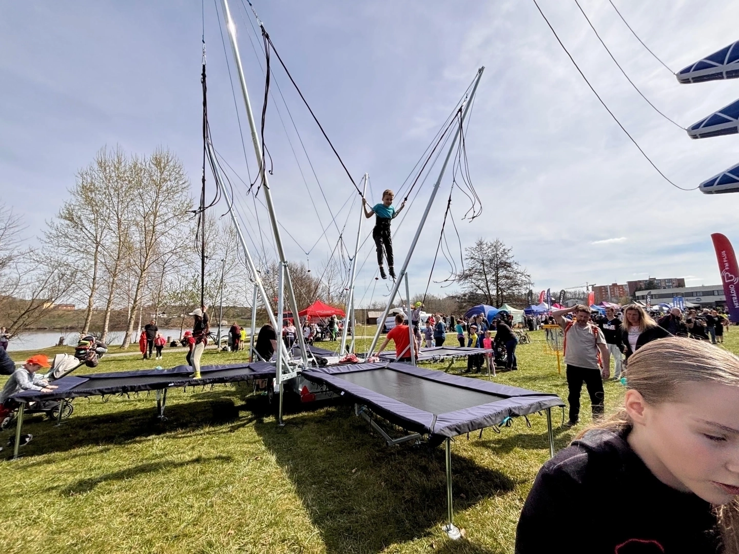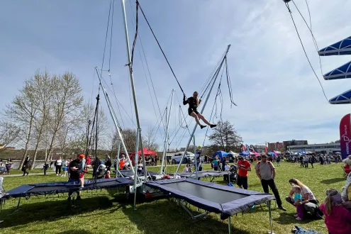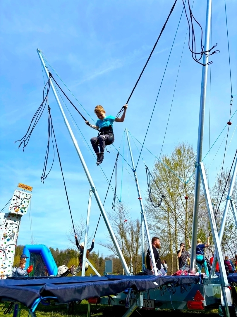 Nabízíme k pronájmu oblíbenou atrakci bungee trampolíny 4v1 - tato čtyřmístná trampolína umožňuje skákat až čtyřem osobám současně, což zajišťuje vysokou průchodnost a minimalizuje fronty na vašem eventu, ať už jde o městské slavnosti, dětské dny nebo firemní family days.