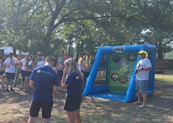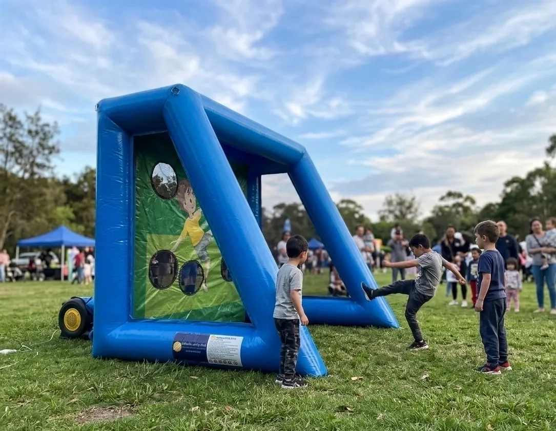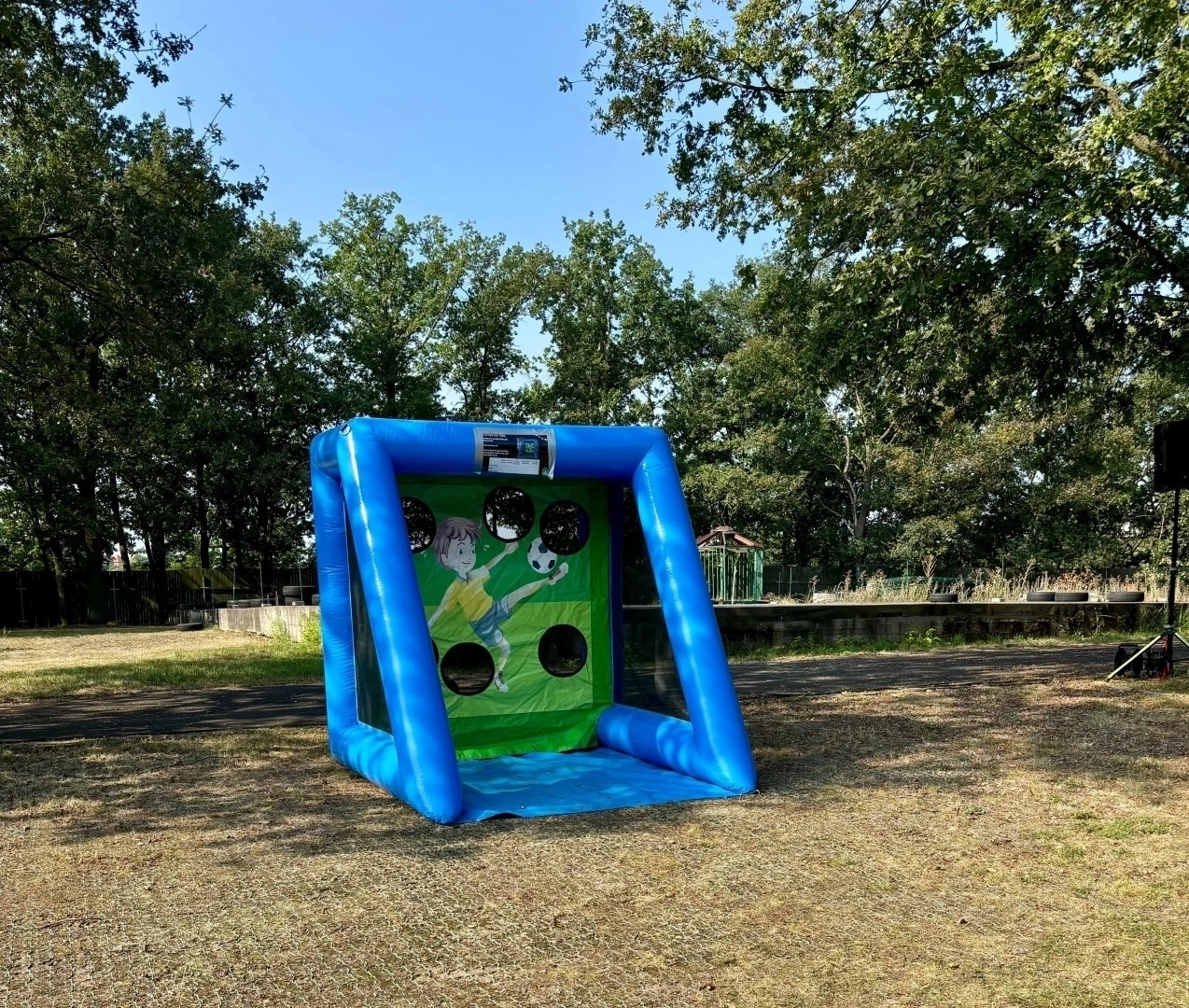 Nafukovací fotbalový terč je oblíbenou sportovní atrakcí, která zaručeně zabaví děti i dospělé. Cíl hry je jednoduchý, ale výzva je to veliká: trefit fotbalový míč přímo do otvorů v plachtě a nasbírat co nejvíce bodů! Soutěžit mohou malé děti, teenageři i dospělí. Stačí jen umět kopnout do míče.