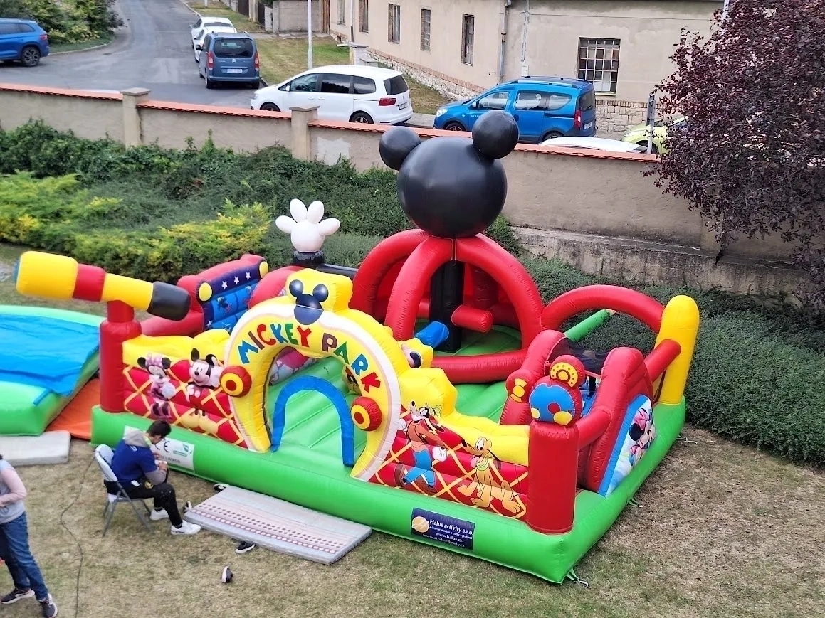 Naše nafukovací atrakce Mickeyho klubík přenese děti přímo do světa jejich oblíbených hrdinů od Disneyho! Tento pestrobarevný skákací hrad s motivem Mickey Mouse, Minnie, Goofyho a Pluta není jen obyčejná skákací plocha. Je to interaktivní hřiště, které zaručí hodiny bezpečné zábavy.