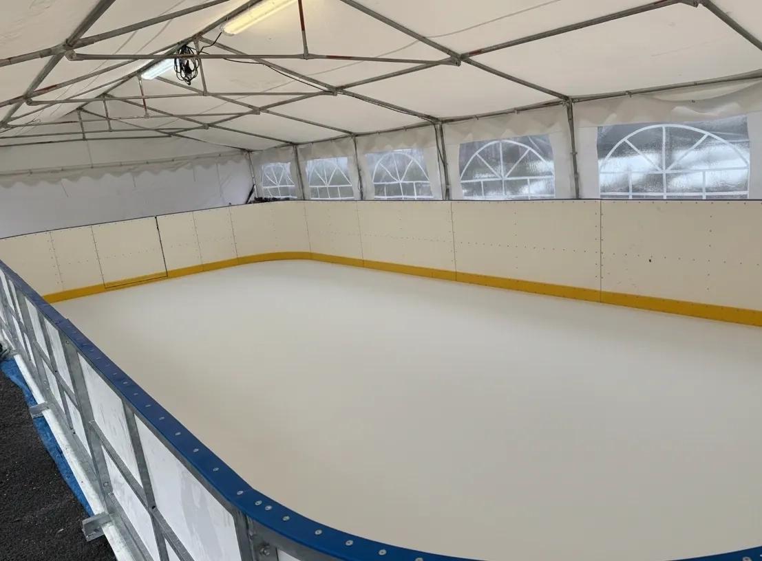 Nabízíme pronájem mobilního kluziště s hokejovými mantinely – aréna se syntetickým ledem.