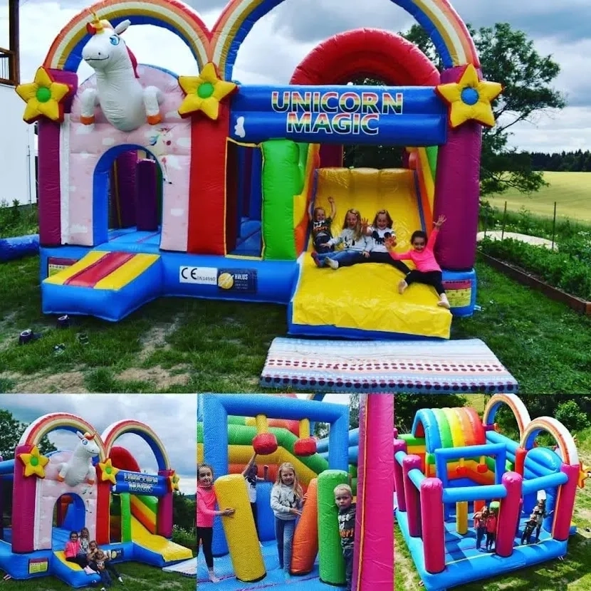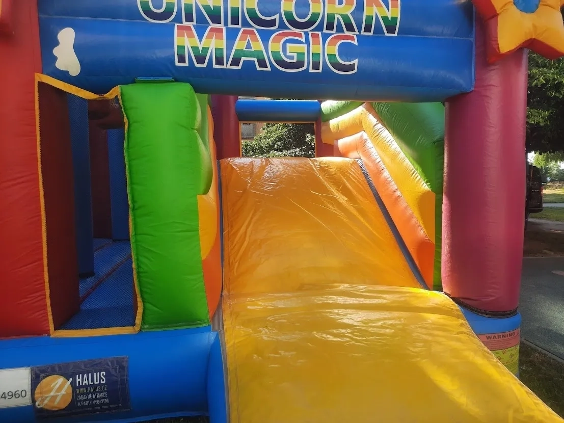 Skákací hrad Jednorožec (Unicorn) je splněným snem každého dítěte, které miluje pohádky a magické bytosti. Tento pestrobarevný hrad s motivem duhy a hvězd se okamžitě stane ozdobou vaší zahrady.